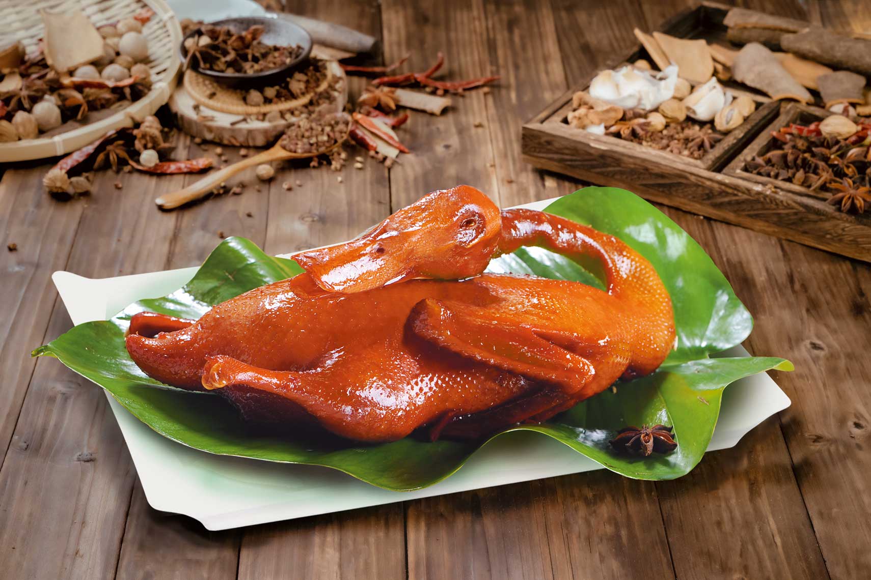 采用天然放養的麻鴨為原料,經滾揉腌制、烘烤、醬制等十多道工序制...